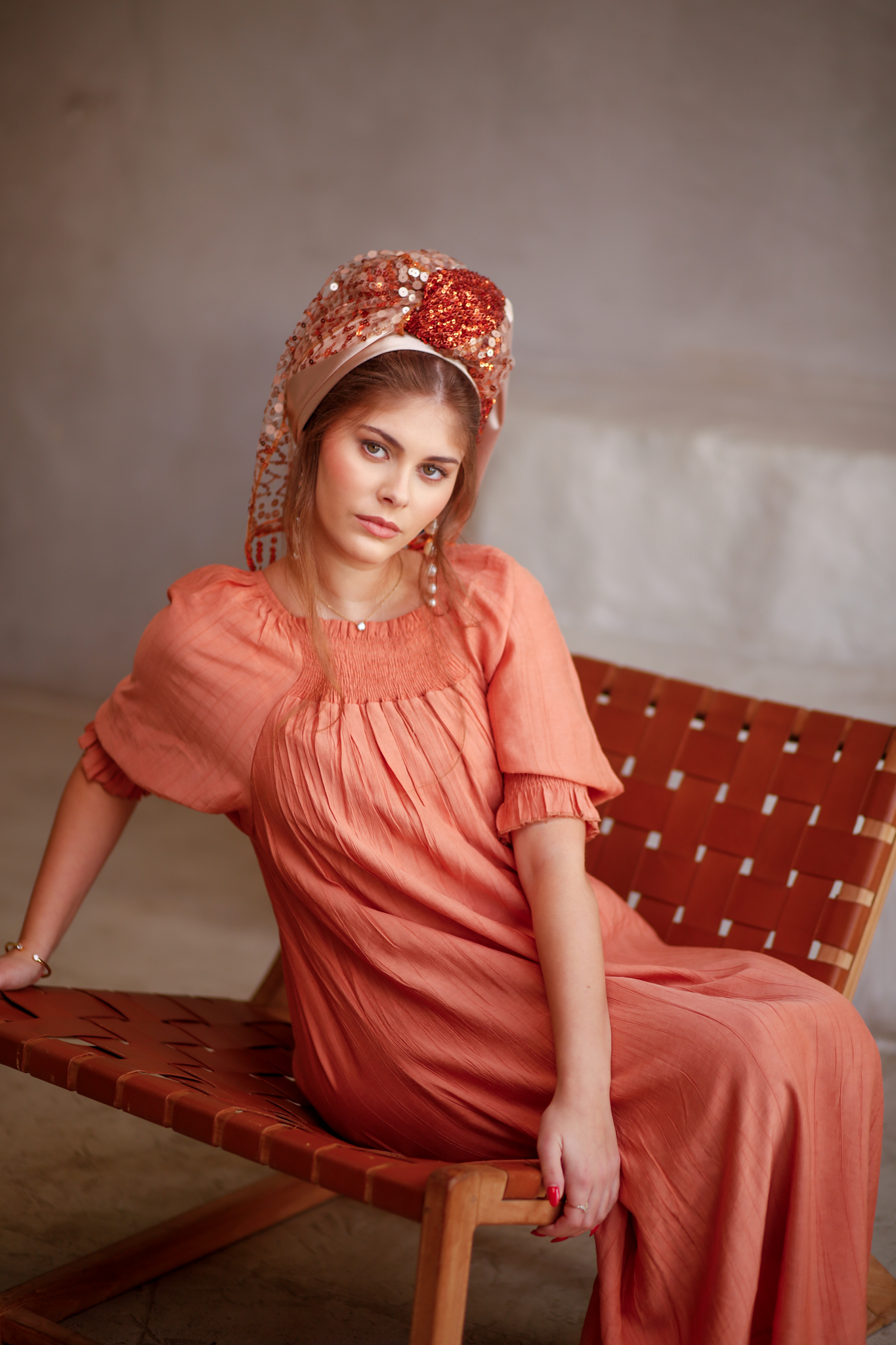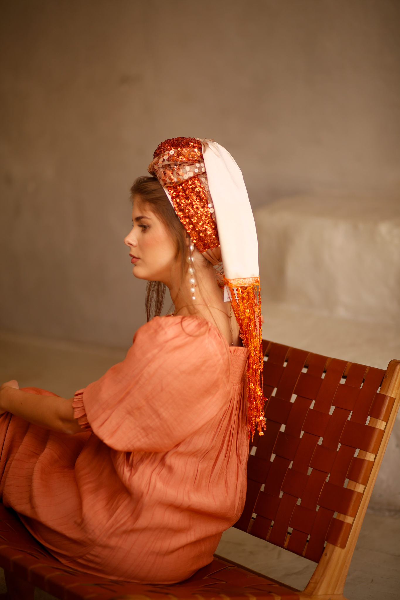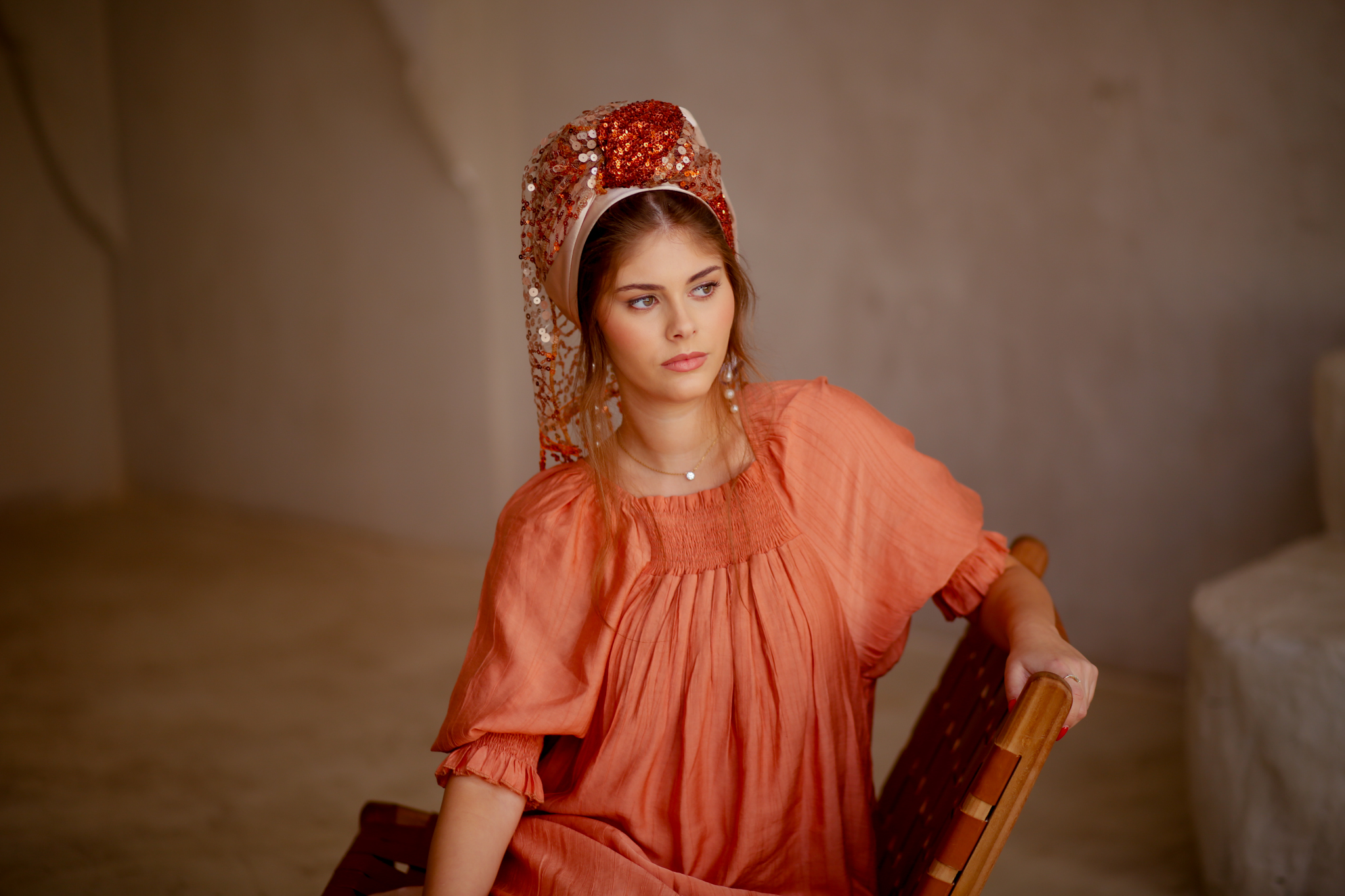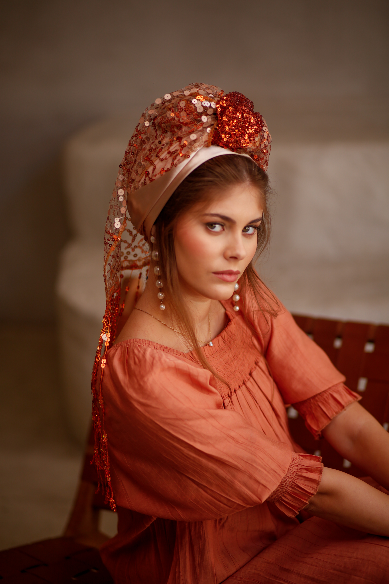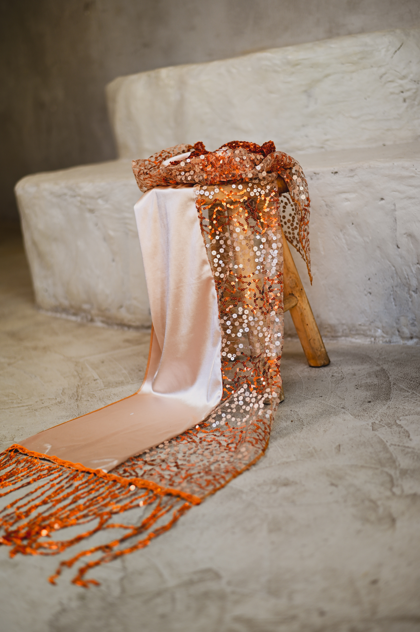 מטפחת לונג מלבני בצבעי ניוד – בז' וכתמתם בשילוב בד רשת משולבת פייט ,בד ארמני ובד משובץ פייט ואבנים