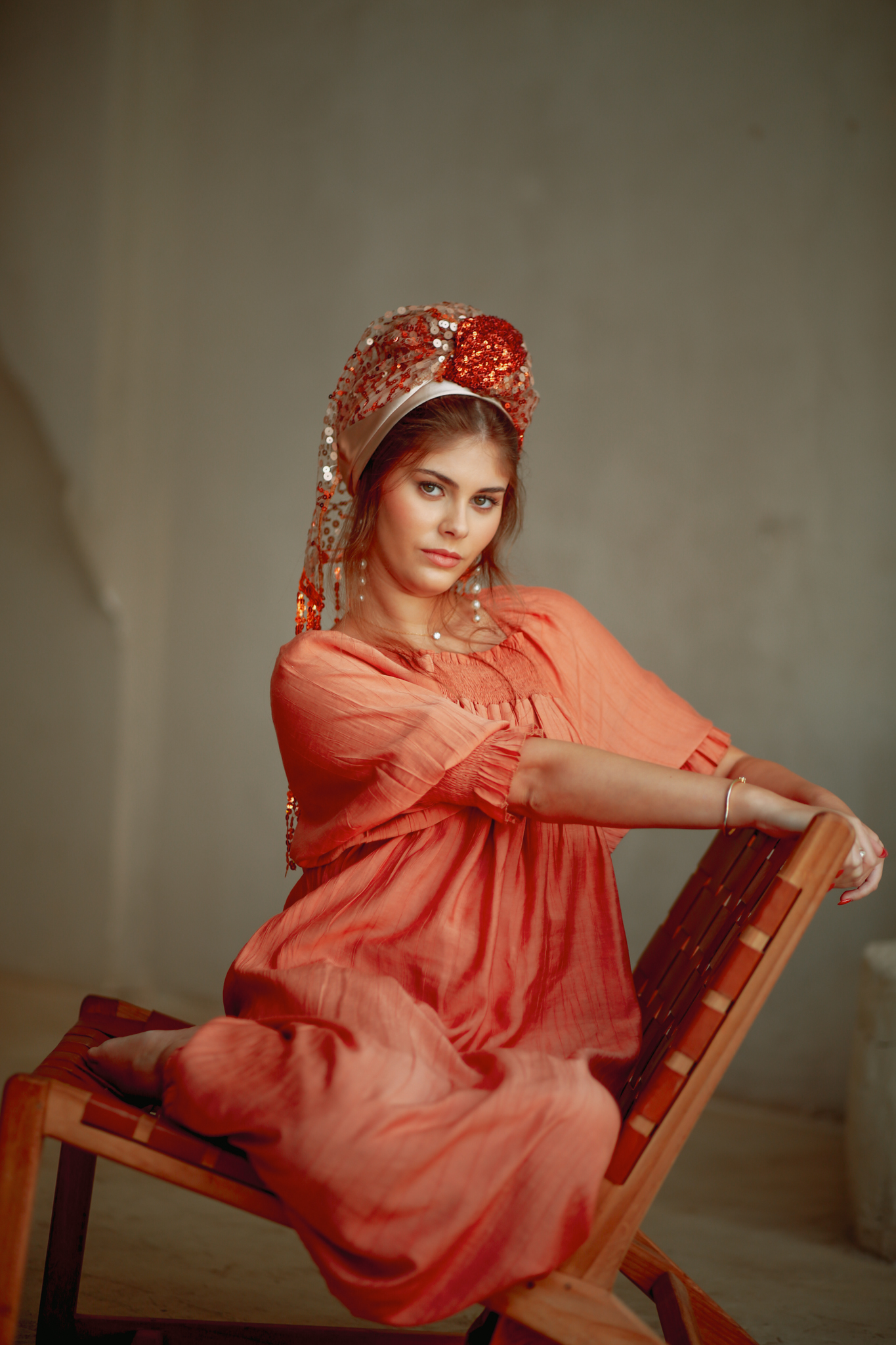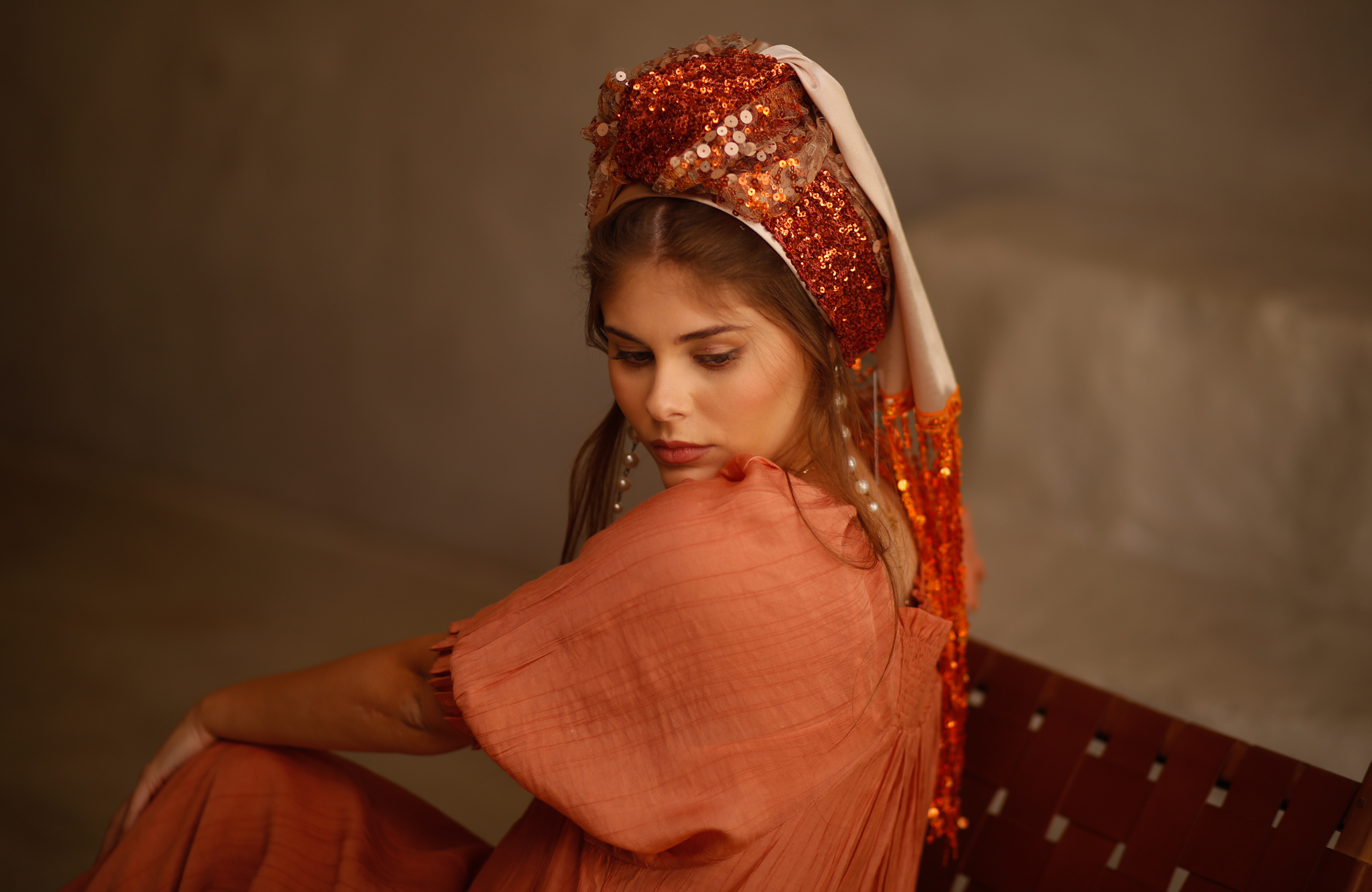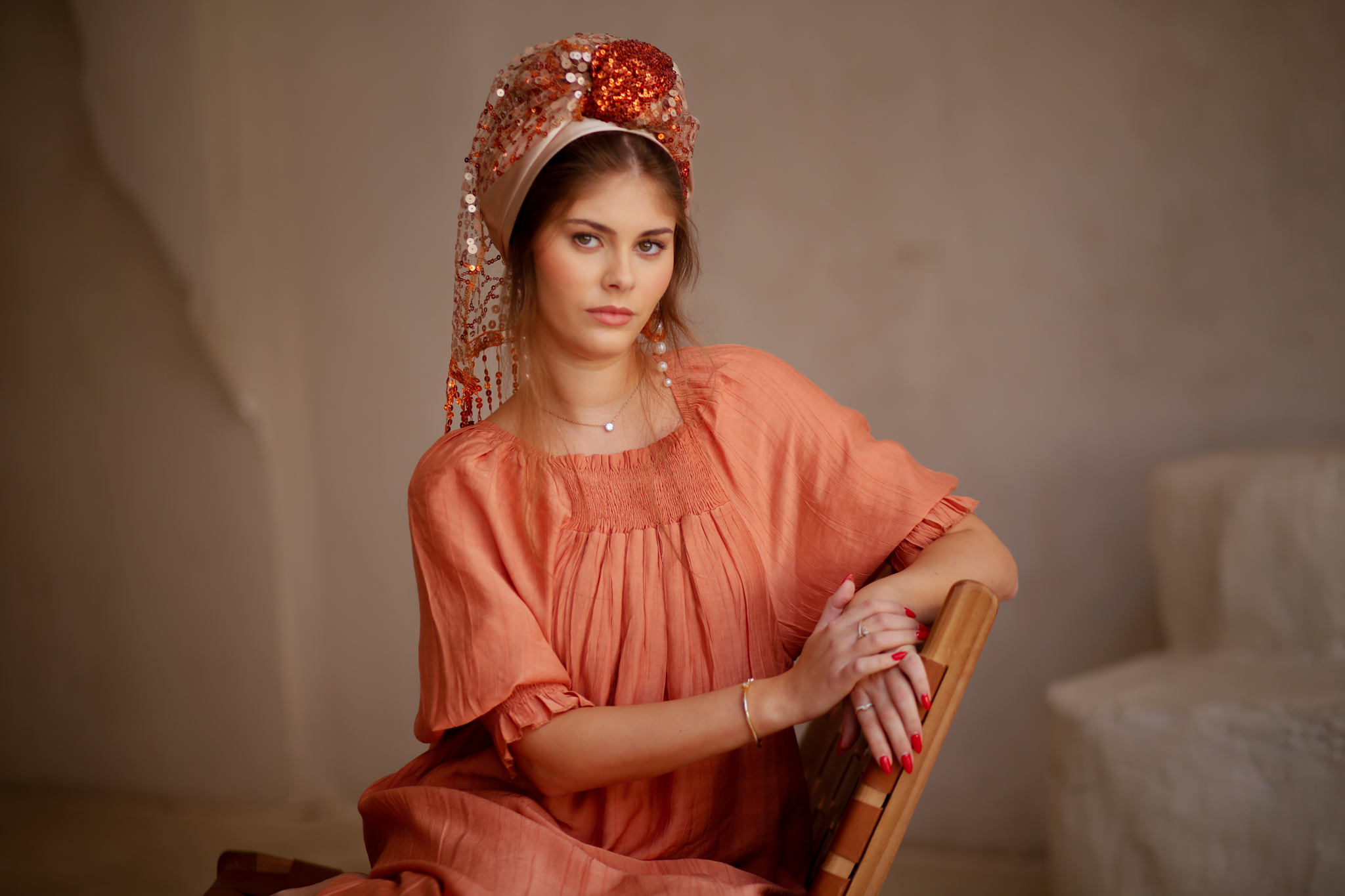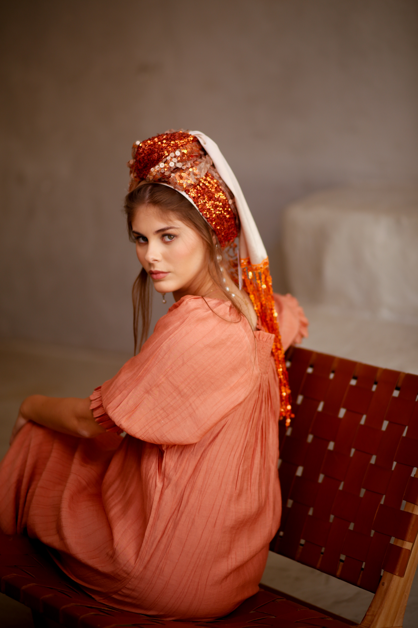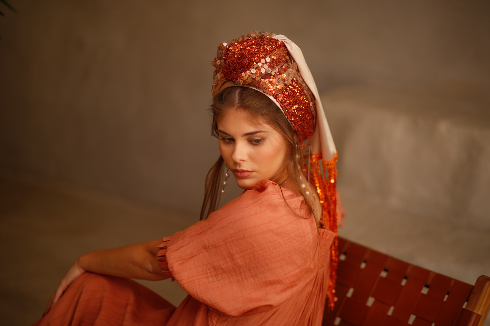מטפחת לונג מלבני בצבעי ניוד – בז' וכתמתם בשילוב בד רשת משולבת פייט ,בד ארמני ובד משובץ פייט ואבנים